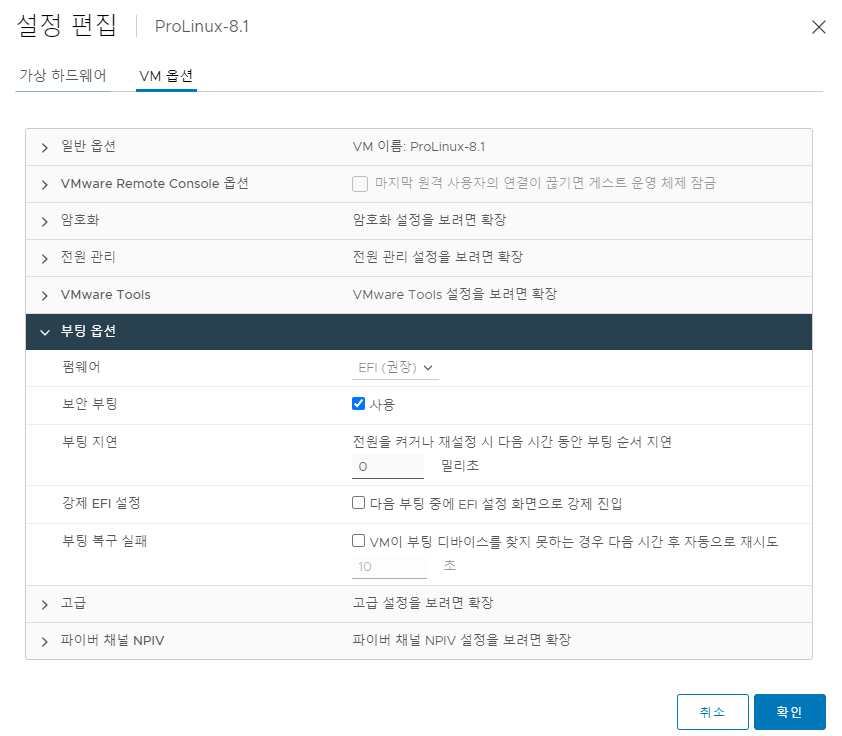 VM 옵션 탭에 보안 부팅이 사용하도록 체크되어 있으면, 체크를 해제하여 Secure Boot 사용하지 않도록 변경 후 확인 버튼으로 설정을 적용