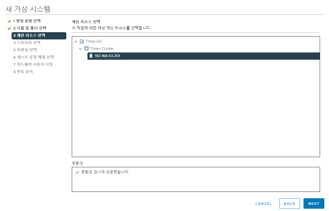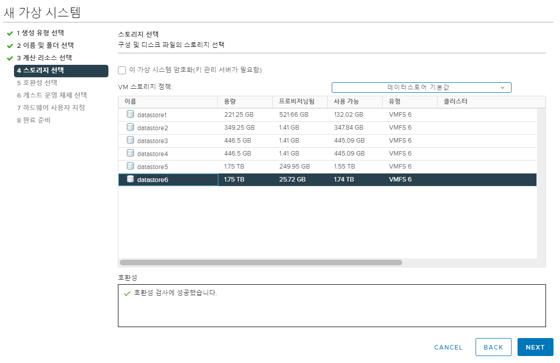 VM이 사용할 저장공간 자원을 어디서 끌어올지 데이터 스토어에서 선택합니다.