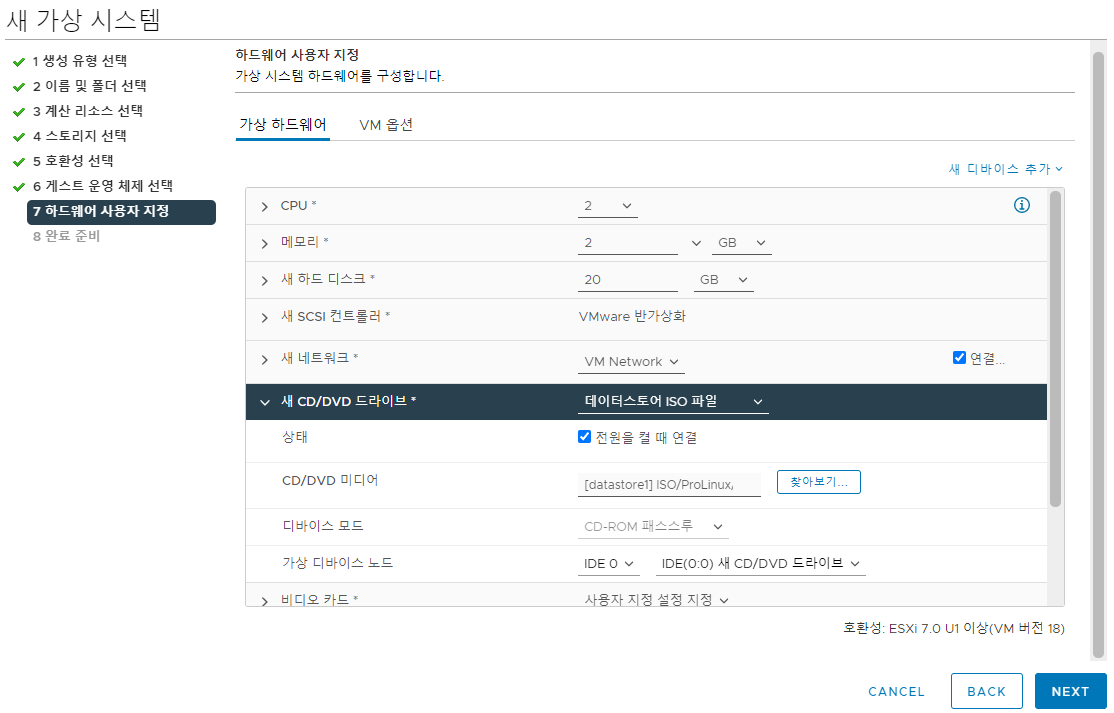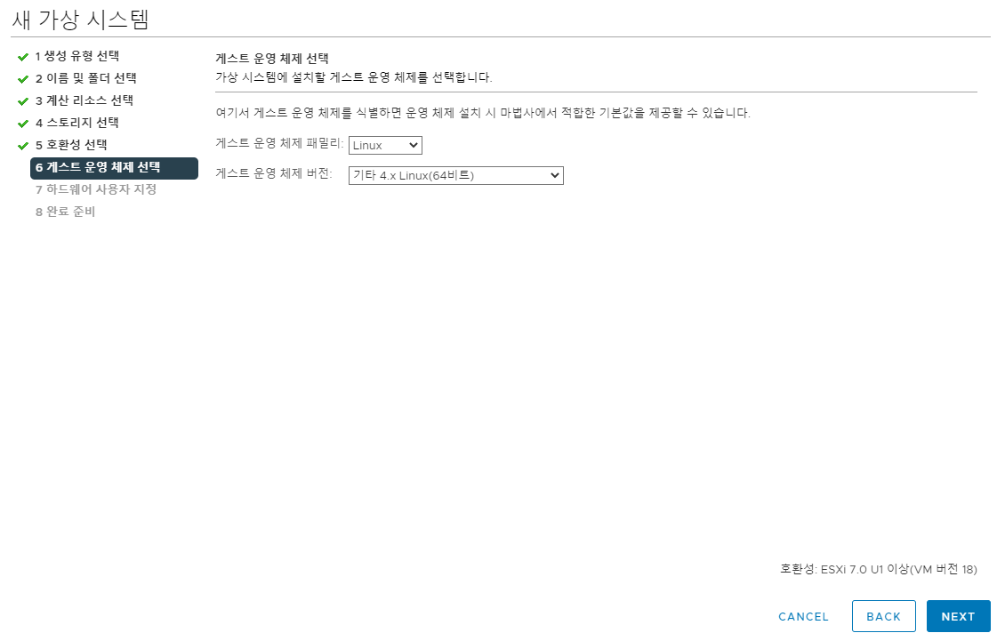 ProLinux 제품은 VMWare 사와 상호 인증이 진행 완료된 상태가 아니기에, 기타 4.x Linux(64비트)를 선택합니다. 여기서 4.x는 Linux의 벤더 버전을 의미하는게 아니라, 커널 버전을 의미합니다. ProLinux는 4.18 커널을 패키징 하였으므로 Other 4.x Linux(64bit)를 선택합니다.