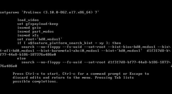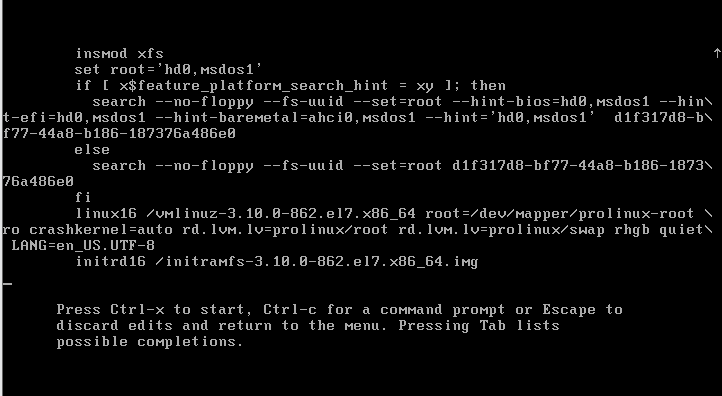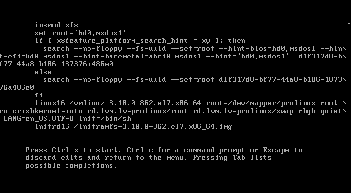 3. 'LANG=en_US.UTF-8' 문자열 뒤에 'init=/bin/sh' 행을 추가 후 Ctrl+X 키를 입력하여 쉘로 진입합니다.